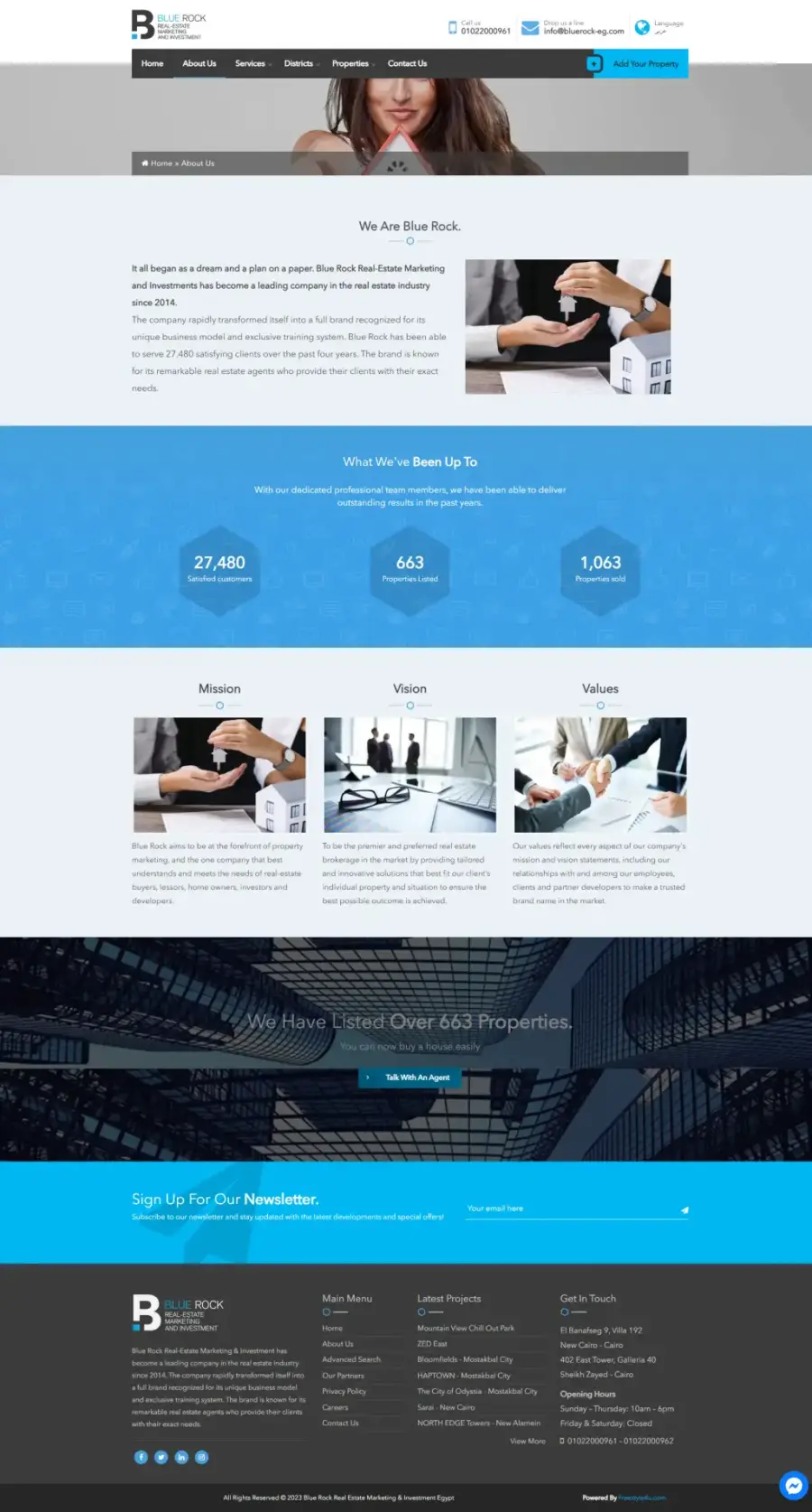 تُعَد بلو روك للتسويق والاستثمار العقاري من الشركات الرائدة في تسويق العقارات منذ عام 2014. سرعان ما تحولت الشركة إلى علامة تجارية كاملة معترف بها بفضل نموذج العمل الفريد ونظام التدريب الحصري. وقد نجحت خلال السنوات الأربع الماضية في خدمة 27,480 عميلًا راضيًا. تشتهر العلامة التجارية بوكلائها المتميزين الذين يلبّون احتياجات العملاء بدقة.